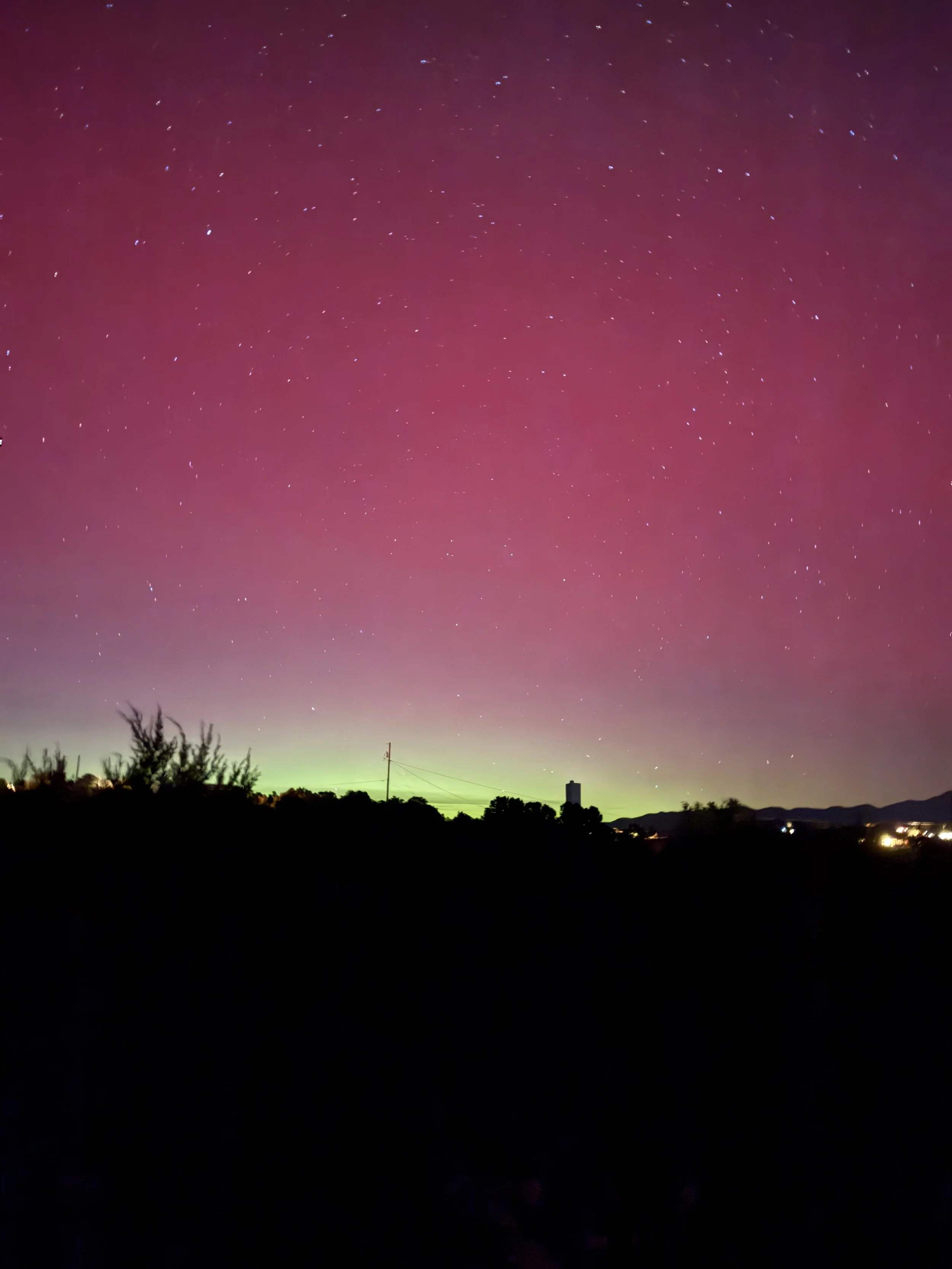 One of the many delights of Santa Fe is the active community of board gamers. On Tuesday evenings you’ll usually find us at Rowley’s Farmhouse Gastropub. This week we played Flip 7 and Cash and Guns. Hector, our waiter, was amused to come back to our table and find us all pointing foam guns at one another. Towards the end of our evening someone mentioned that they were headed to a park on the north side of town to see the northern lights. So, instead of heading straight home, we made a stop at Chula Vista where the skies are darkest towards the north. Stepping out onto the back deck, I was first struck by the number of stars. The Pleiades sparkled, Cassiopeia’s W hung overhead as Orion and his sword rose over the mountains to our east. Between the stars the night was not black but a deep plum. At the northern horizon a band of light separated land and sky, as if there were a town nearby in that direction. The cameras on our phones revealed the barely visible light more clearly.