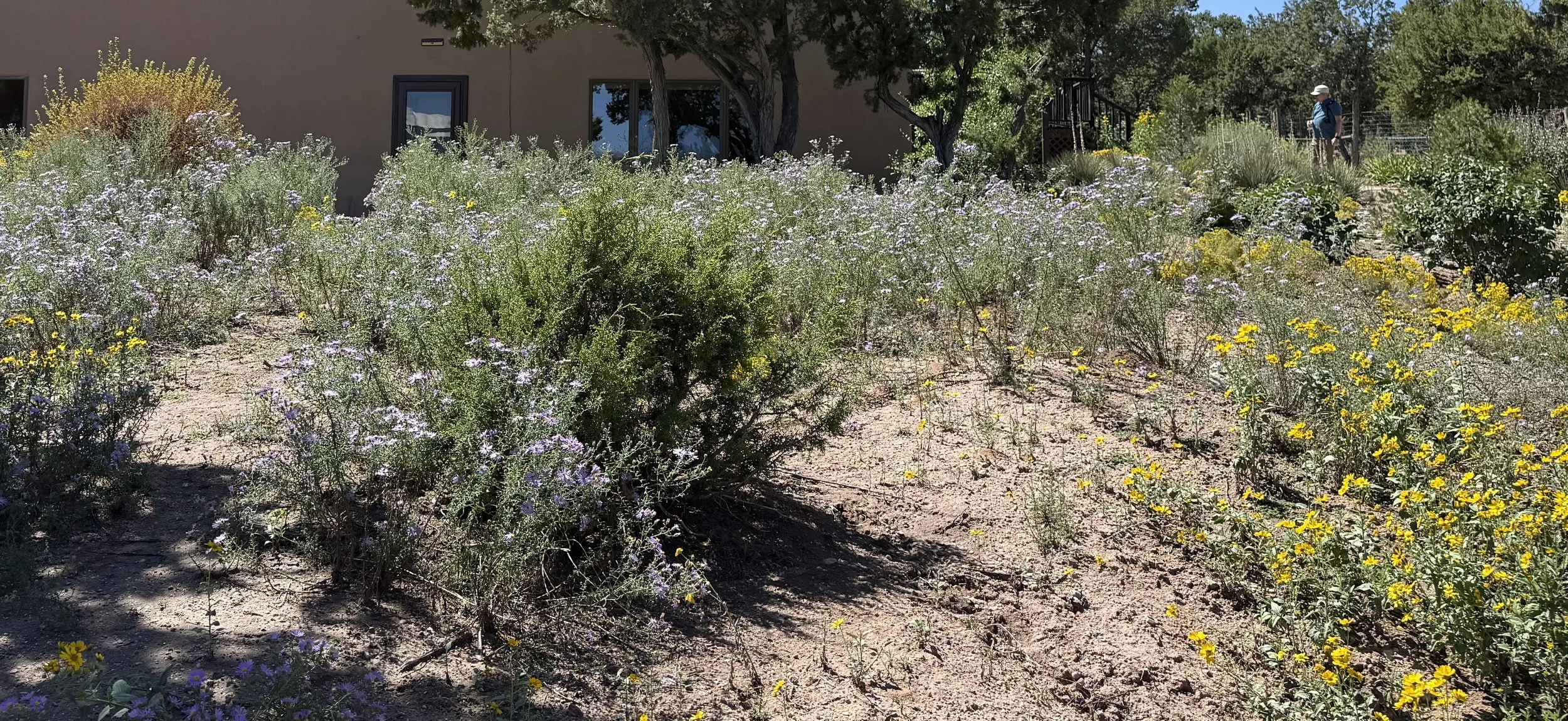 Our new house, Chula Vista Casa, presents many opportunities. The front yard is mostly a gravel driveway with some Juniper, Pinon, and low shrubs, fairly plain. Over to the side we could plant some shade-loving flowers for a pop of color. Currently the backyard is wild with purple aster and a yellow daisy of some sort. The only spot where there are no flowers is the scar from the septic installation.