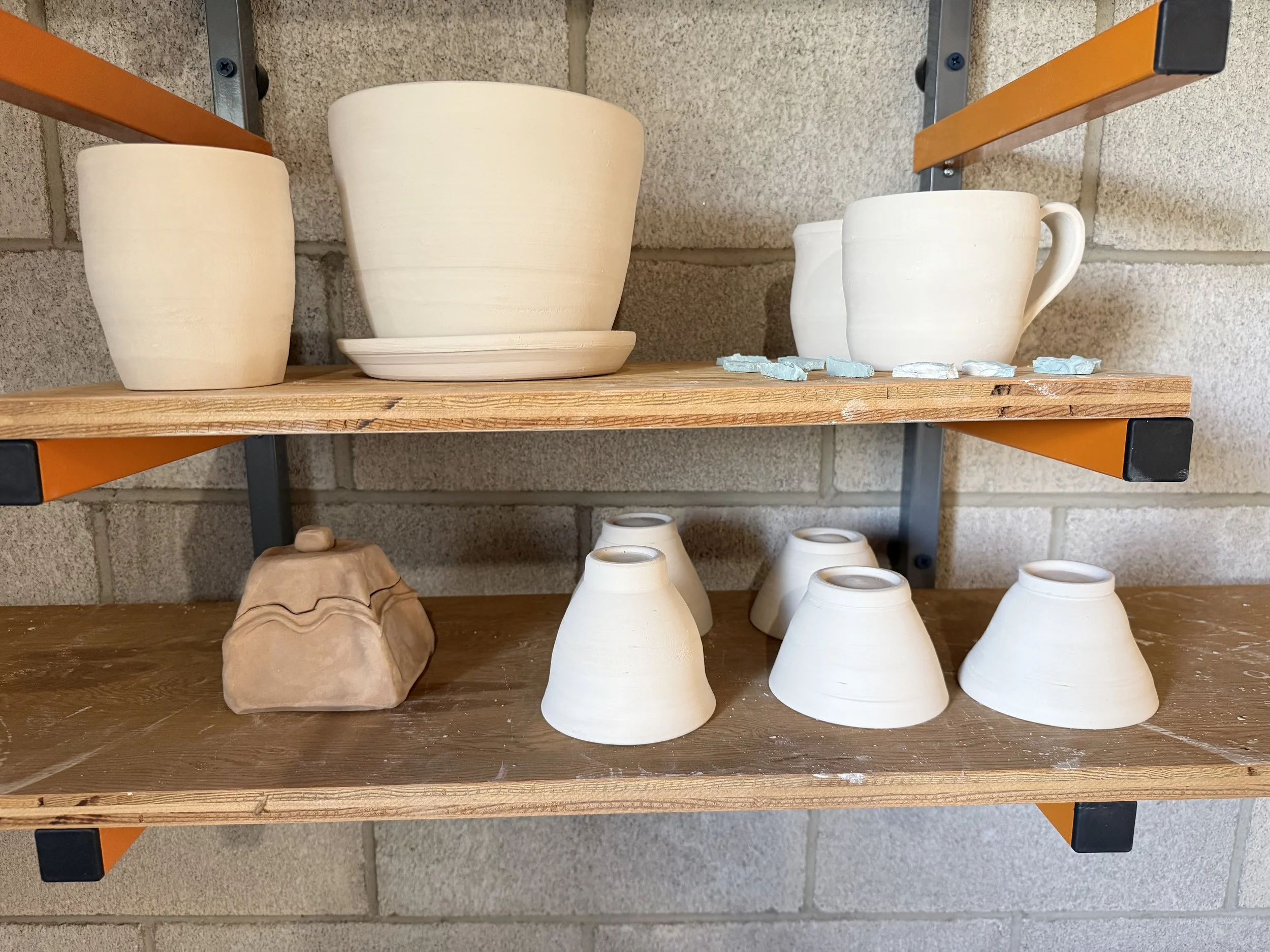 I’m excited! Yet I have a few problems still to solve. The 400g batches fit nicely in some tall jars that were perfect for test tiles, but this will not work for anything that’s not long and skinny. Will I need to make a bigger batch to glaze the items I have on my shelf waiting to be bisqued (see below)?