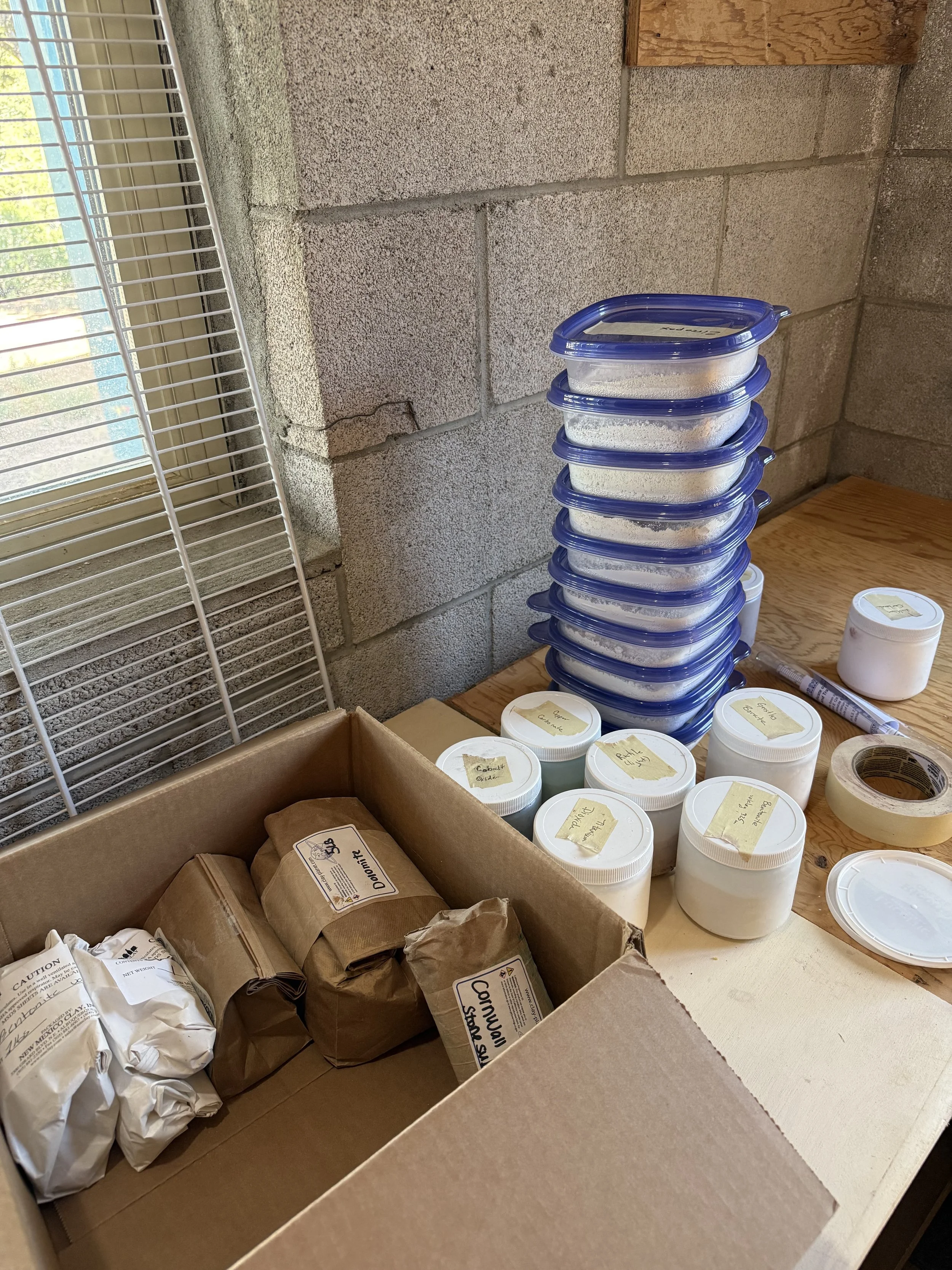 A benefit of doing my own pottery firings is that I can use whatever glazes I fancy. It’s possible to order pre-mixed glazes, and there are some beautiful ones, many well known among potters. For those willing to mix their own, the possibilities expand, while (eventually) the costs diminish. It took four orders from three different suppliers to get ingredients for a couple of glaze recipes. On each order I added another few ingredients for some other possibilities. Now I have towering piles of (mostly) small samples to experiment with, in “tupperware”, jars, and their original bags (see below. I hope that Dolomite comes in handy because the smallest quantity I could order was five pounds).