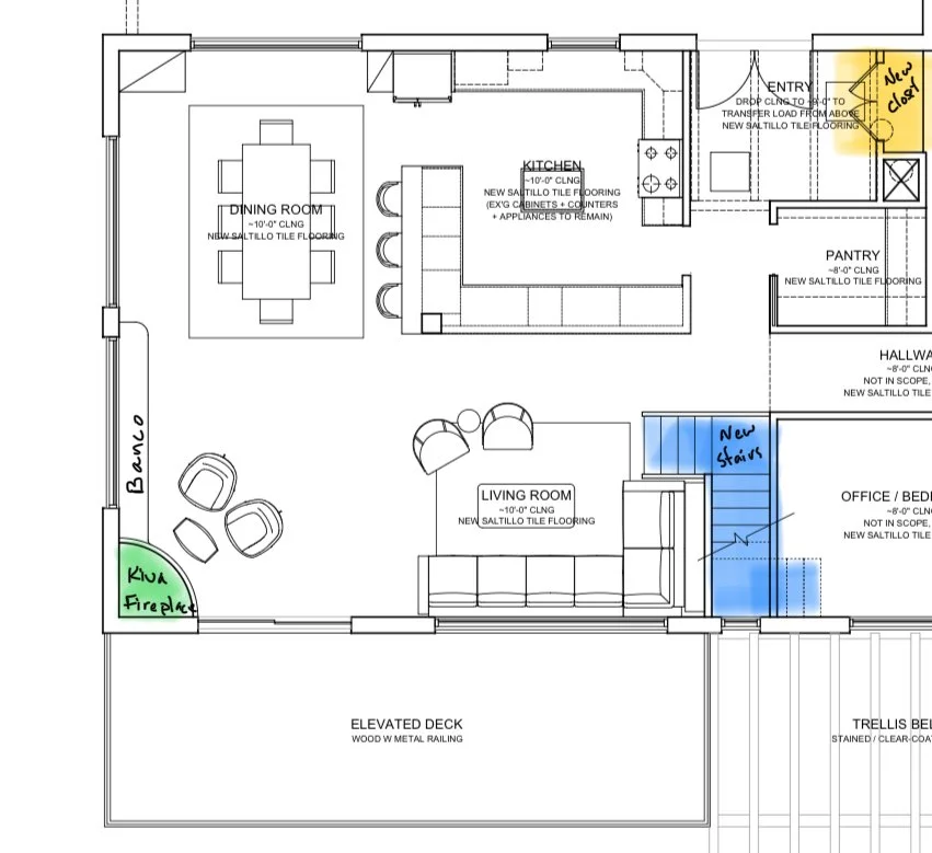 At the end of the living room opposite of the stairs the new kiva fireplace (highlighted in green) will replace the gas insert. Next to it will be a “banco” seat with wood storage.