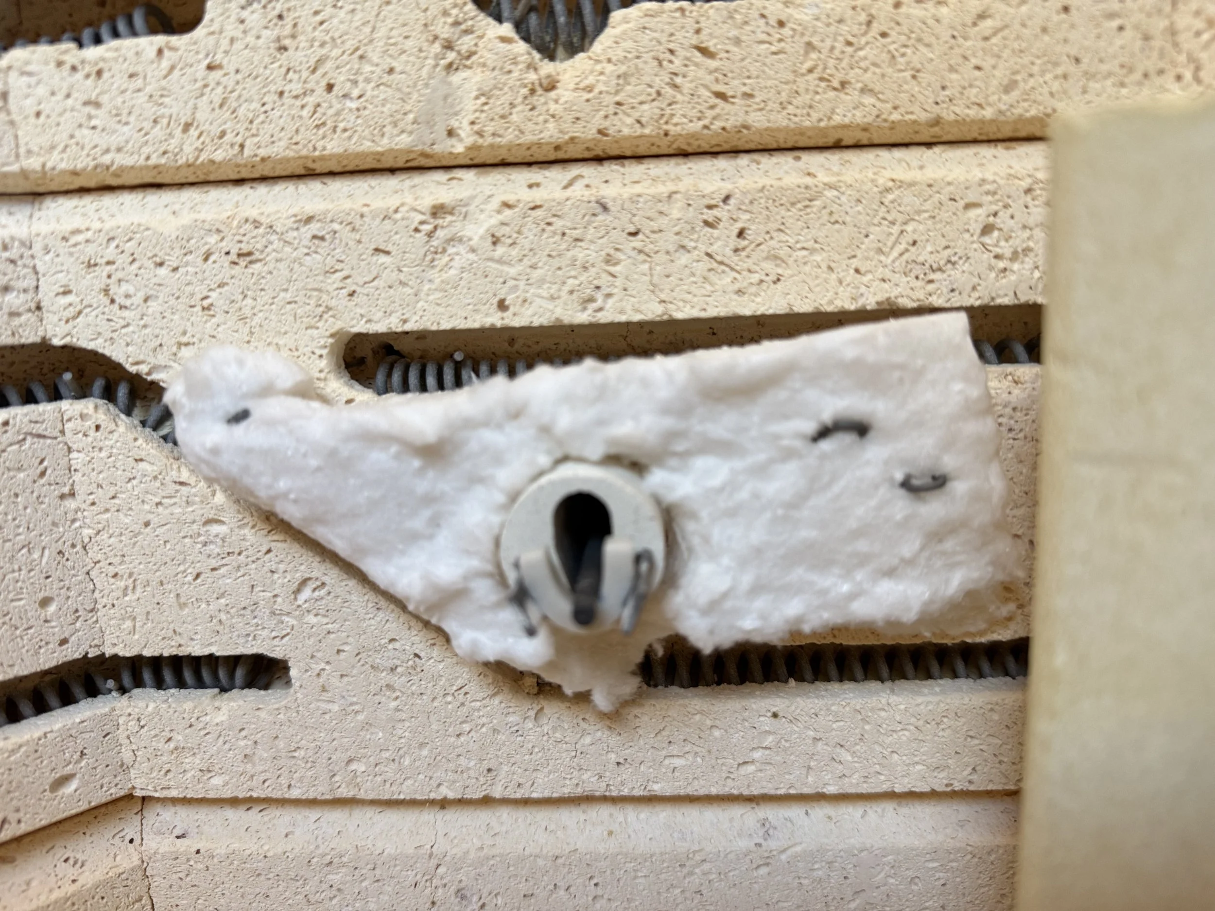 The kiln sitter has a metal “sensing” bar that goes through the kiln wall. On the inside, this bar rests on a small pyrometric cone that melts as it reaches the target temperature. When the cone has bent sufficiently, lowering the bar inside the kiln, the part of the sensing bar on the outside of the kiln lifts to release a falling weight that turns off the kiln. The “sensing” bar actually has no sense; it’s just a seesaw. (Below: the kiln sitter after firing with melted pyrometric bar. Also, a little repair of the firebrick around the kiln sitter using ceramic blanket.)