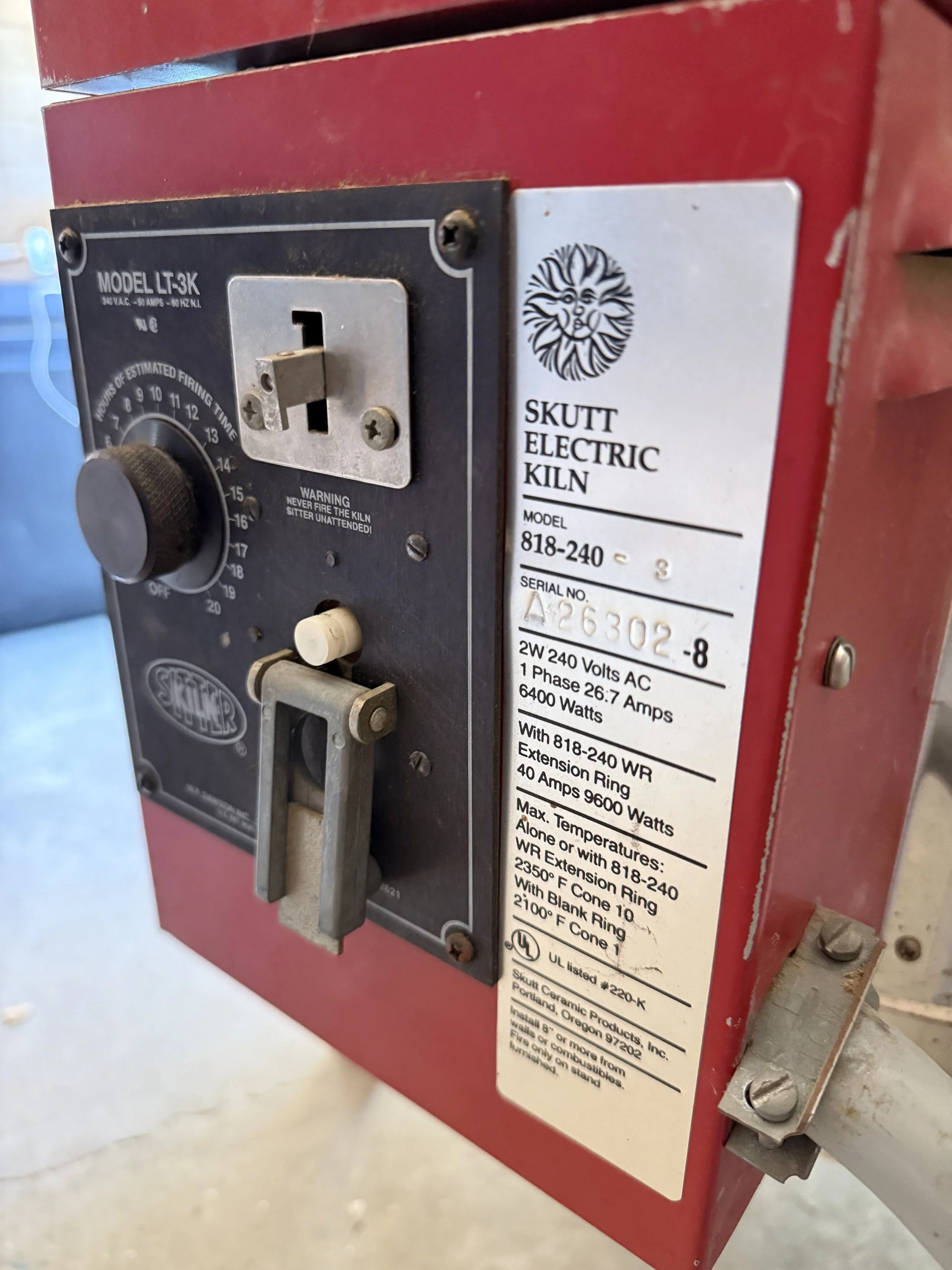 As neat as this is, I don’t fully trust it and have also a pyrometer stuck in one of the peepholes to monitor the temperature inside the kiln as it fires. One firing the kiln sitter tripped within 10 degrees of the goal. On the next, it never tripped. Who knows what might have happened had I not been closely tracking progress. When you invite the fires of hell into your basement, it’s good to have both a belt and suspenders. (Below: the outside of the kiln sitter with the falling weight down. )