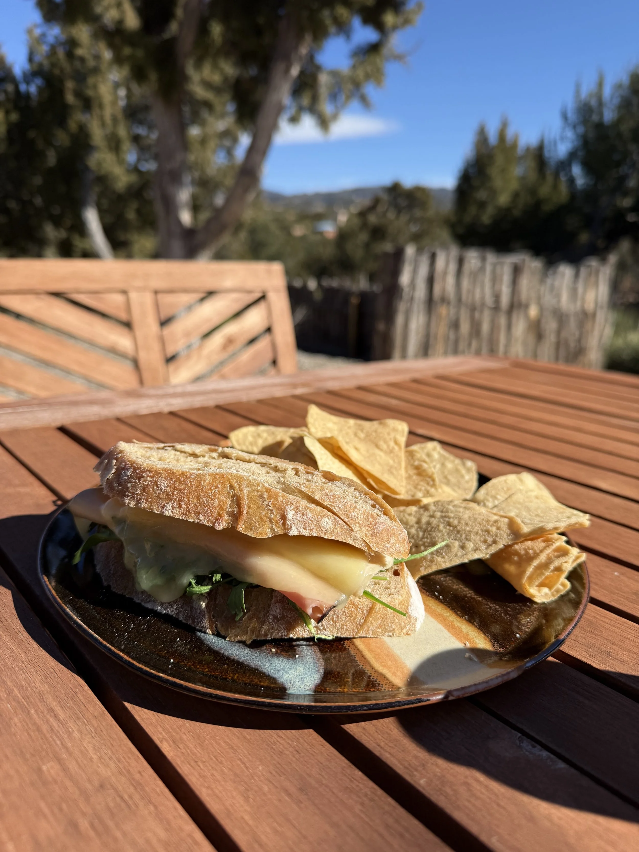 Yesterday one of our fountains was groaning for water. Going out to fill it I discovered that sitting in the sunshine was comfortable, delightful even, in short sleeves. We brought our lunch out to the side yard to enjoy the last sunshine of the day. (Note the wavy hack on the bread).