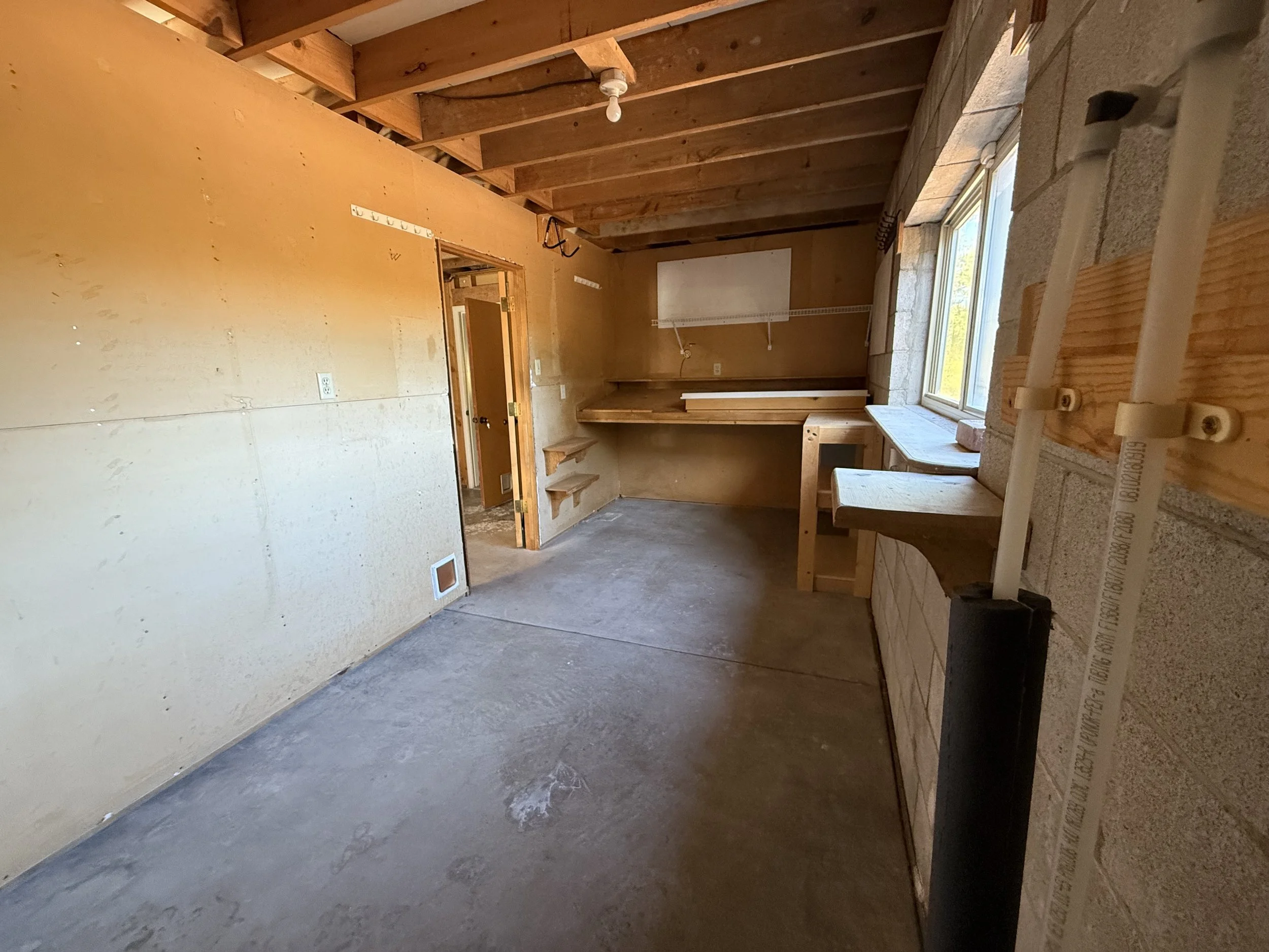 Next to the large open room, there’s a smaller room (pictured below) that might be good for a pottery wheel. Making pottery is messy and creates lots of dust, especially throwing and trimming. I’d rather contain that dust to this corner than to dirty the larger room. Our renovation plans would have the long leg of our new stairs going down through the desk/workbench over across the room, but there’s still plenty of space and even some natural light.