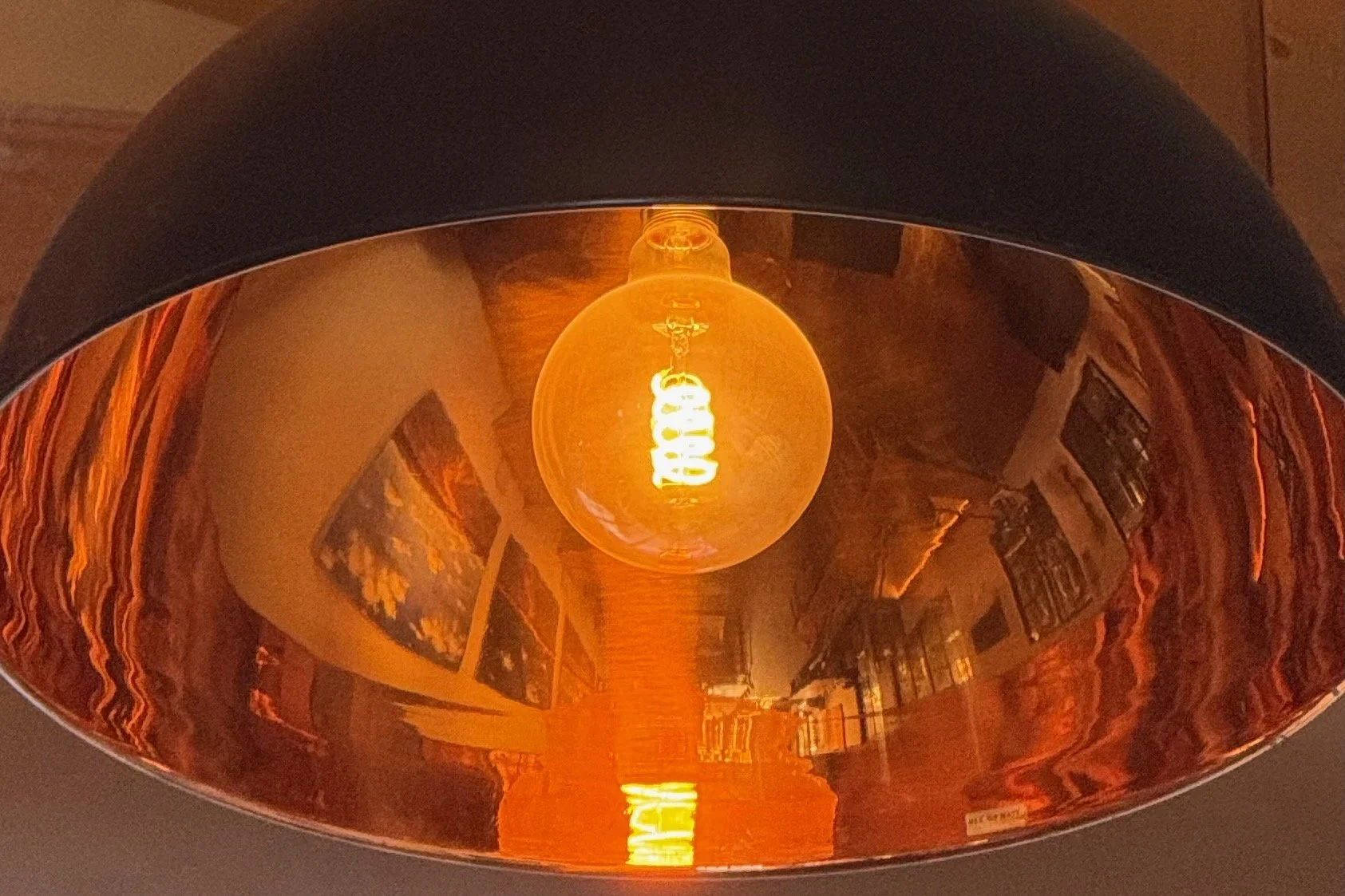 Kelly and I were sitting in Nuckolls Brewery & Taproom in the Railyard when I looked up and saw this. Reflected light is often interesting and if it’s reflected from a curved surface, particularly an irregular curved surface, it’s really interesting. Those are reflections of paintings on the wall, and yes the clouds are at the bottom … because the reflection is upside down. If you’re not familiar with this phenomenon, try looking at a reflection in a spoon; be sure to check out both sides.